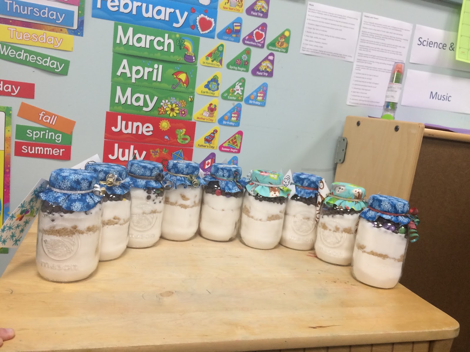 After Niah's activities we planned an activity that the girls could give as a gift for someone in their family - Cookies in a Jar! Working with the guiders and two brownie helpers, the Sparks measured and bottled the ingredients needed for their cookie jar gift. They cut out fabric for the top of their jars and decorated tags of instructions.